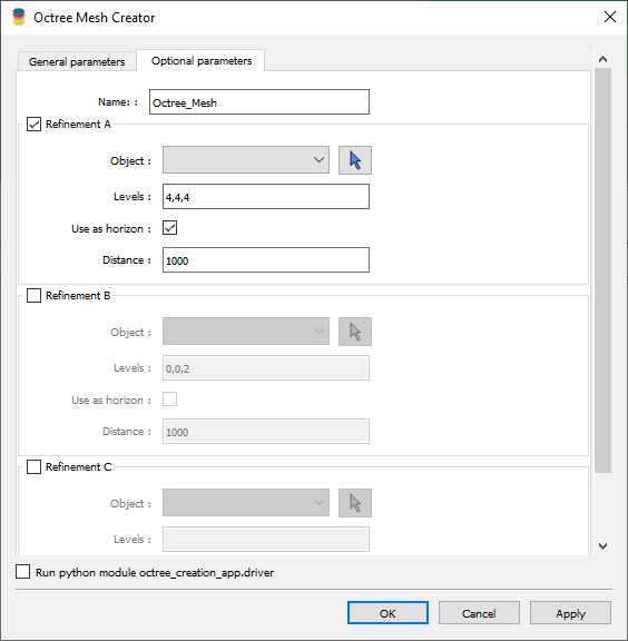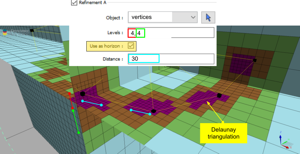 If checked, the object is used as an horizon with the refine_tree_from_surface method instead of the default method. The vertices of the object are converted to a Delaunay surface, which is then used to refine the mesh as layers of cells below the surface.