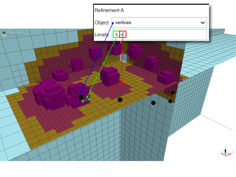 In the example below, the mesh is refined along horizons defined by the vertices of Points object. The parameters are as follows: